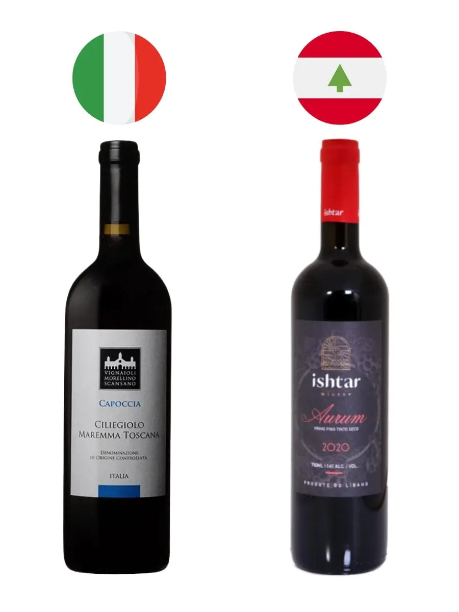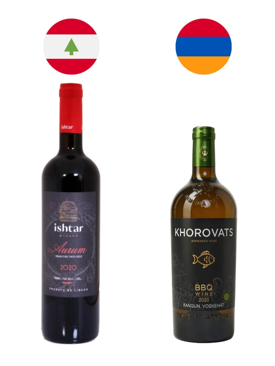 Descubra o Líbano com um vinho tinto potente, envelhecido 12 meses em barricas de carvalho francês, e também a Armênia com um blend de uvas locais, cítrico e mineral.