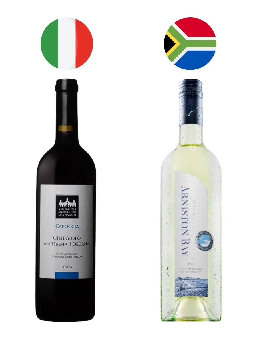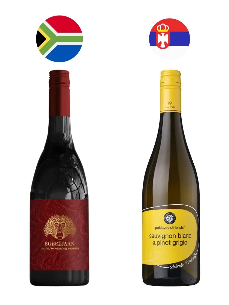 Um vinho tinto sul-africano com um corte típico do Vale do Rhône e um vinho branco da Eslovênia cheio de frescor.