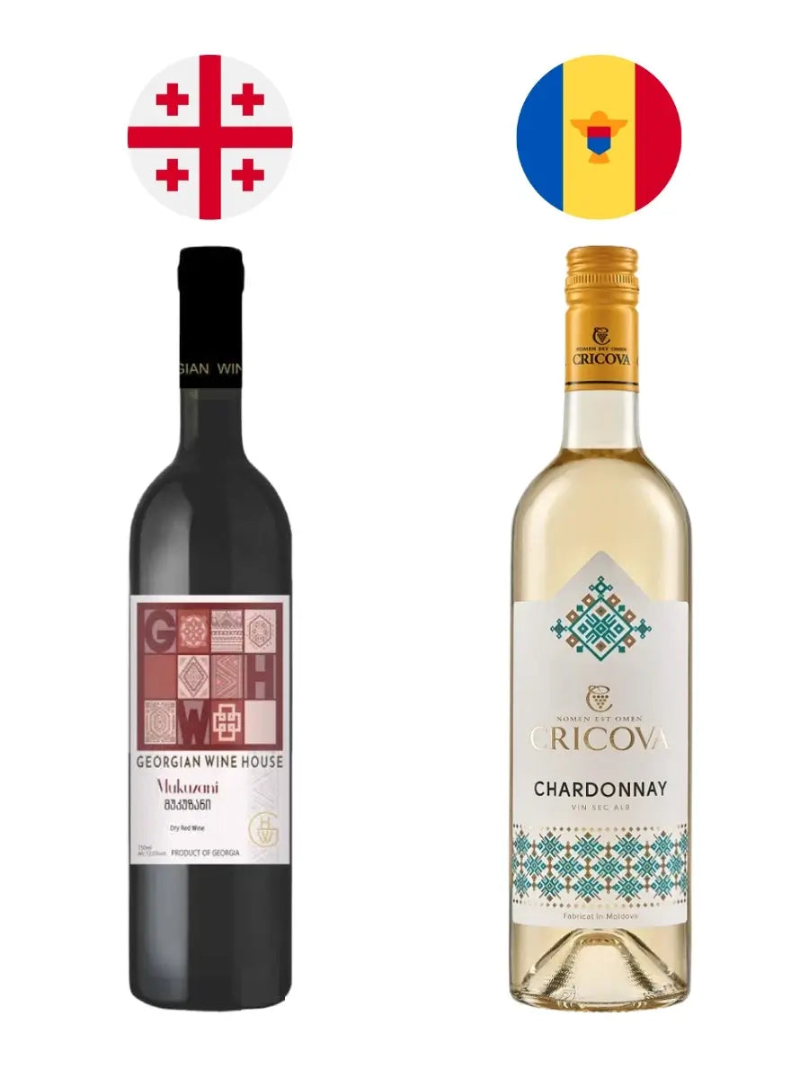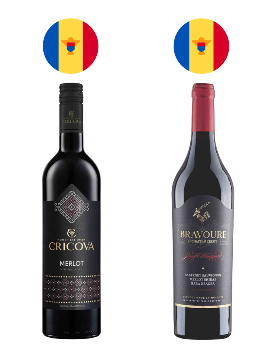 Um agradável Merlot frutado da Moldávia e um blend moldavo que lembra um ótimo Bordeaux envelhecido 12 meses em barricas de carvalho francês.