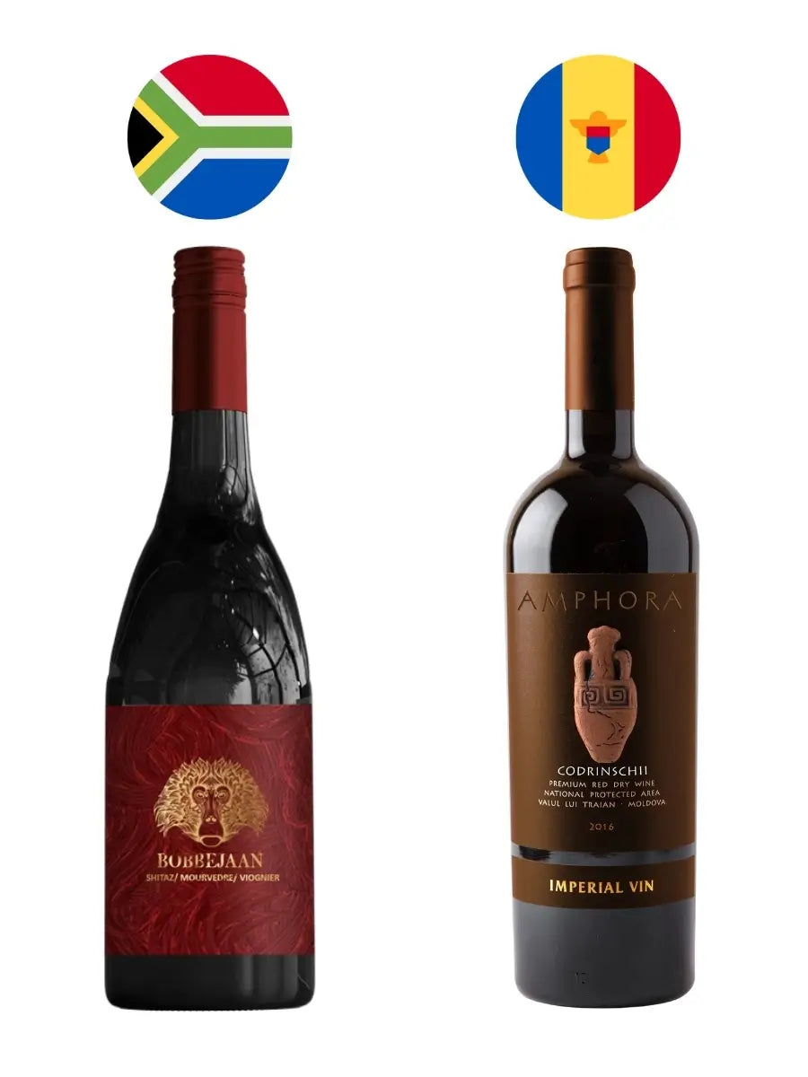 Um vinho tinto sul-africano com um corte típico do Vale do Rhône e um vinho moldavo 100% Cordinschii vinificado em ânfora